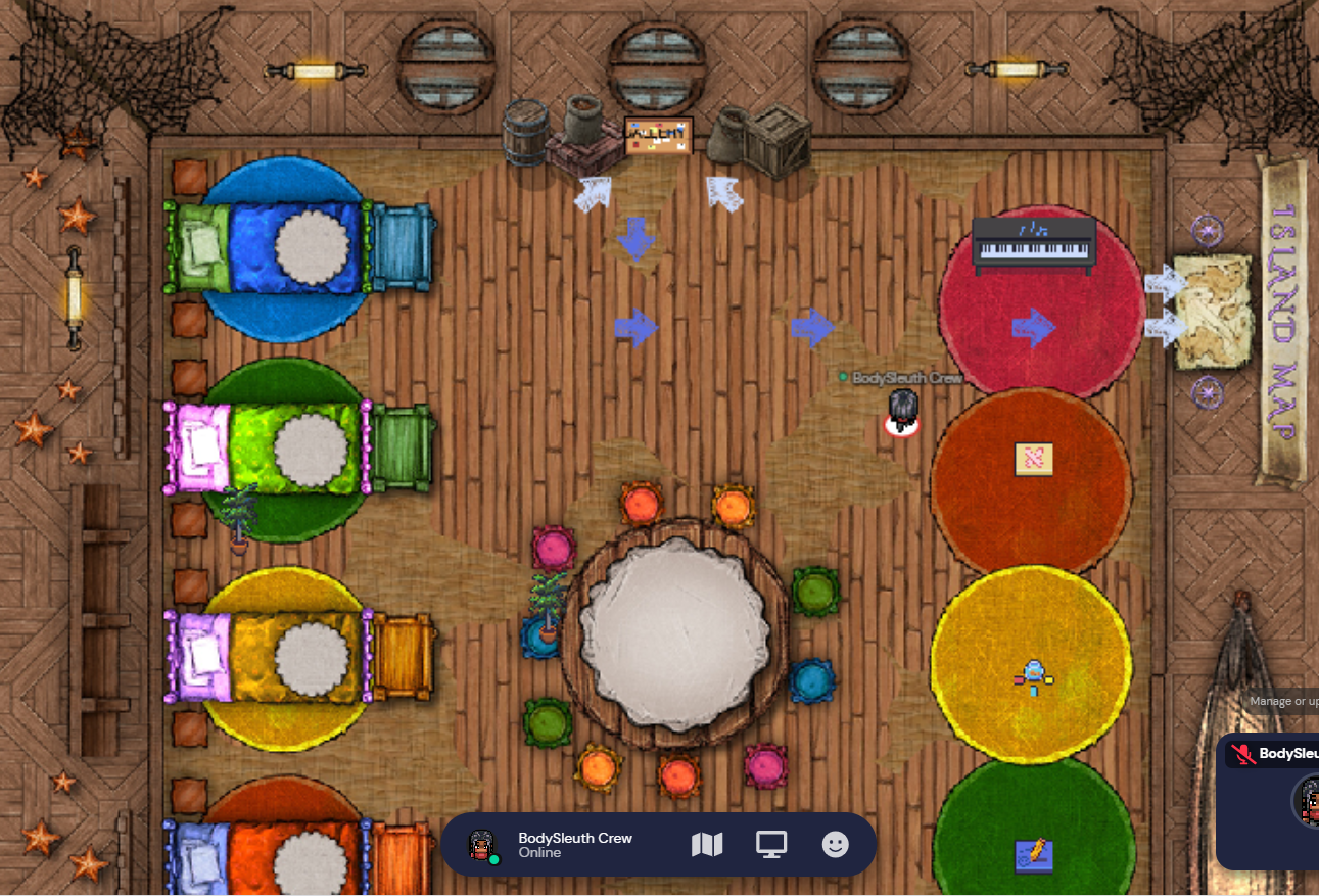 Landing spot for players to arrive in. Included digital tetris and card games, a shared keyboard to play, and access to the island map and community gallery.